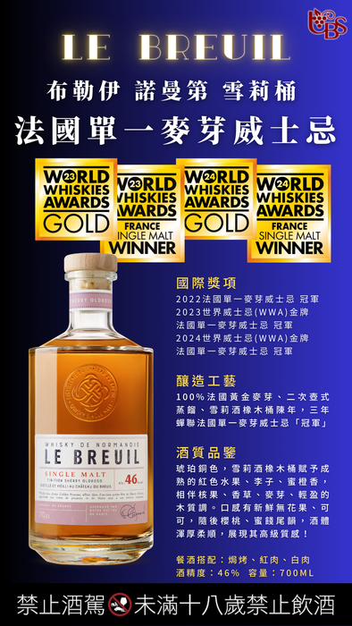 100%法國黃金麥芽、二次壺式蒸餾、雪莉酒橡木桶陳年,三年蟬聯法國單一麥芽威士忌「冠軍」