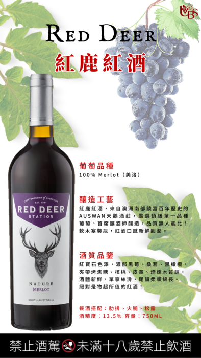 紅鹿紅酒,來自澳洲南部饒富百年歷史的AUSWAN天鵝酒莊,嚴選頂級單一品種葡萄、首席釀酒師釀造,品質無人能比!軟木塞裝瓶,紅酒口感新鮮圓潤。